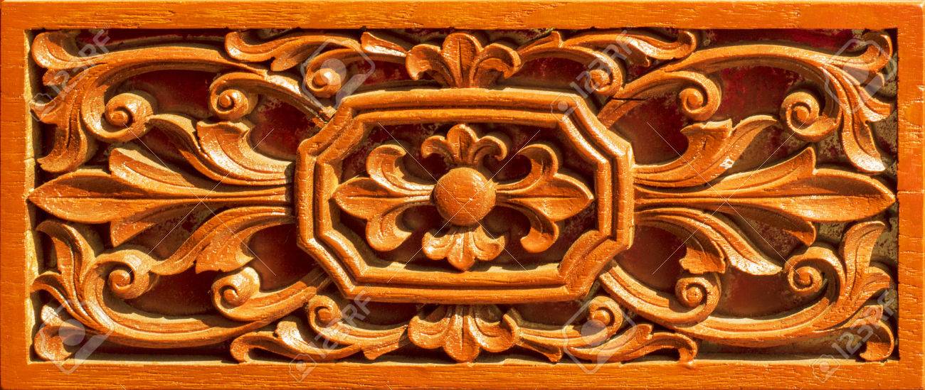 タイ木彫り チェンマイの花パターン歴史的珍しいタイの木のテクスチャを彫る の写真素材 画像素材 Image
